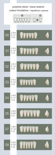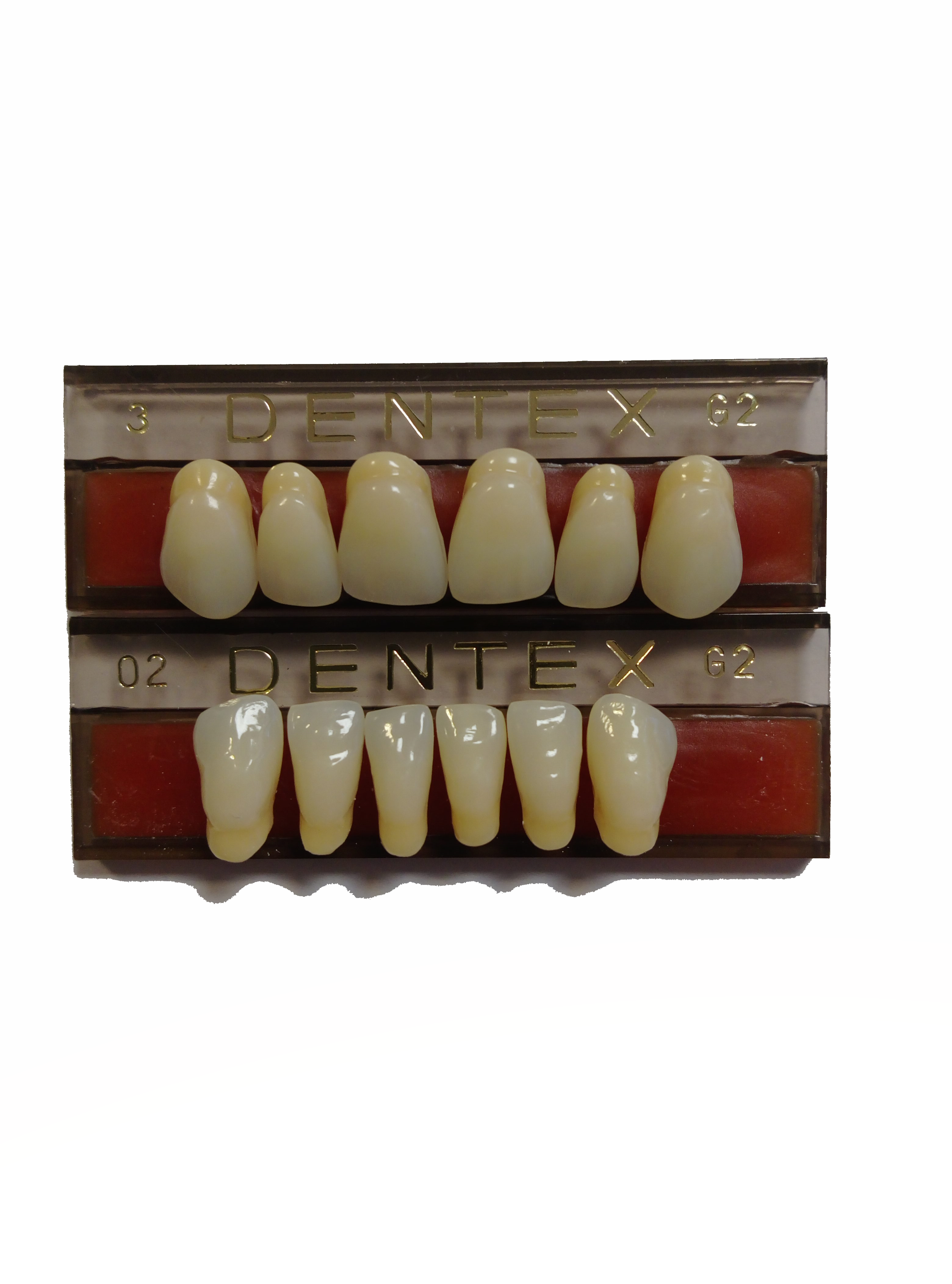 Trójwarstwowe zęby akrylowe w kolorniku Dentex.